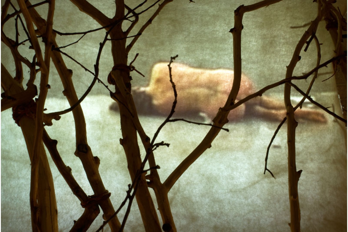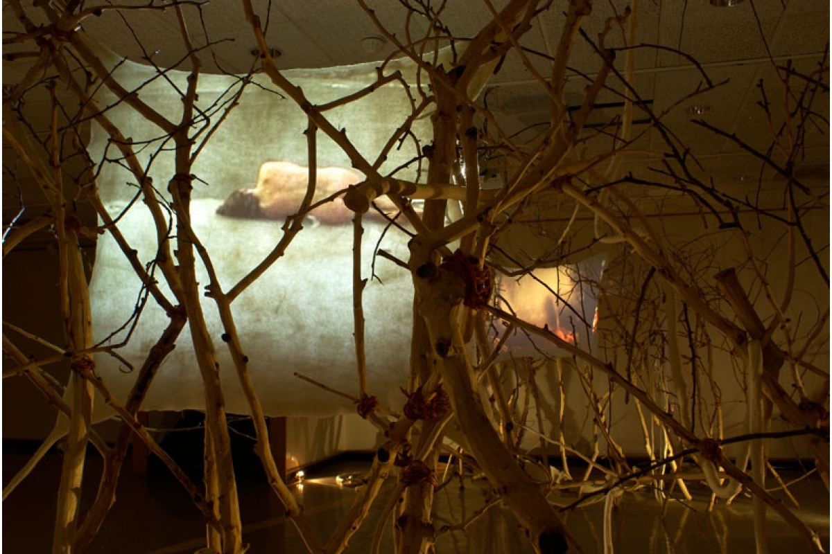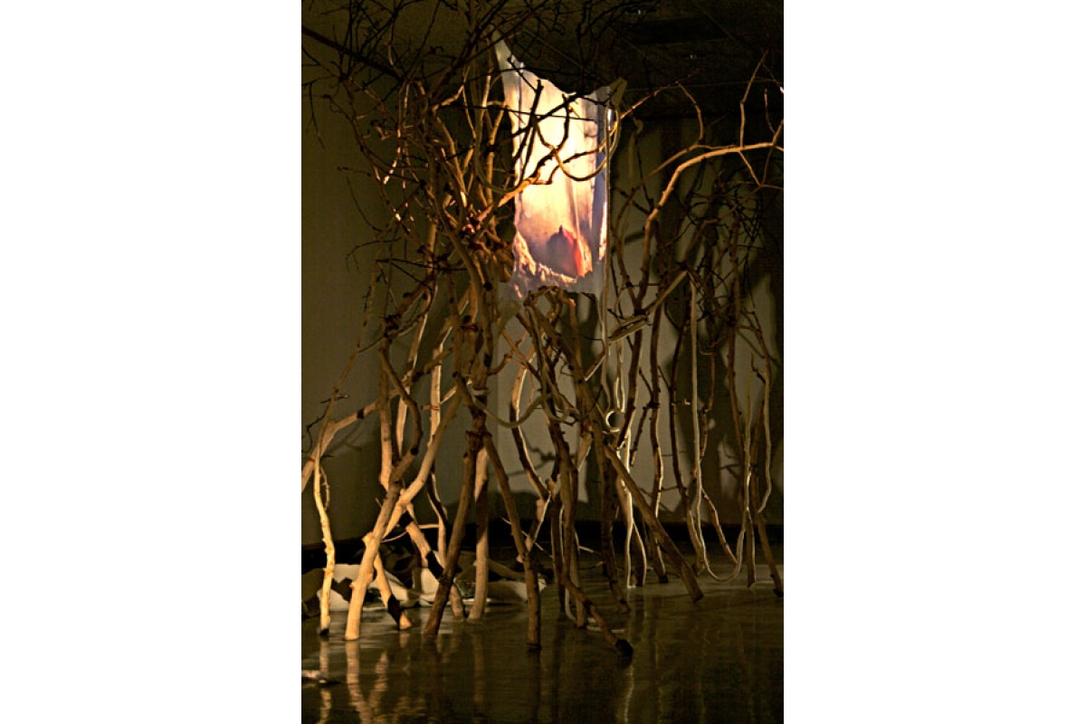 Two channel installation including simultaneous projections of video-performances River of Spirit of Life (2004) and River of Spirit of Life (2008) in an environment of small trees (within gallery spaces). Video images are projected onto felt surfaces. Installation has been exhibited at: